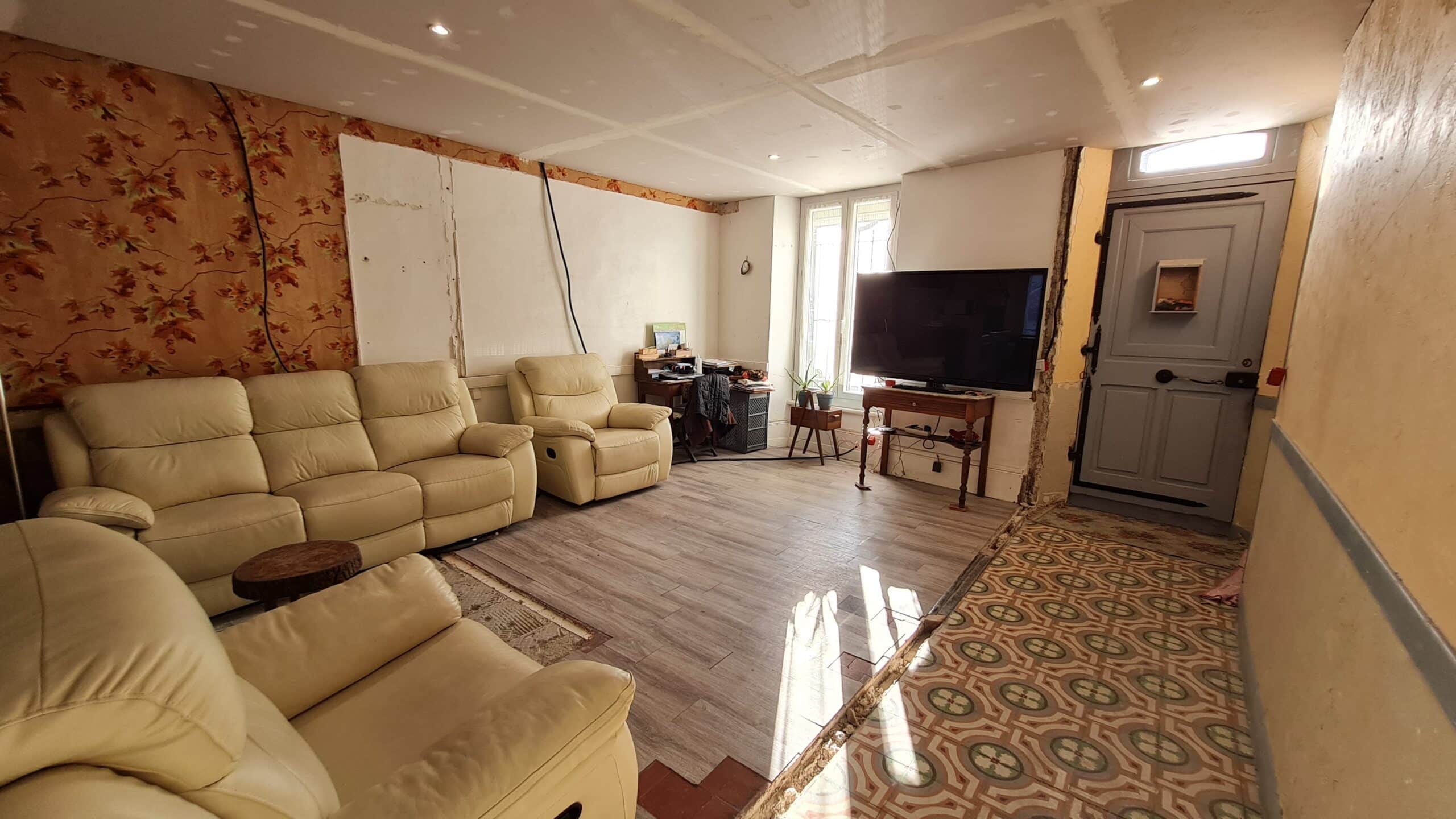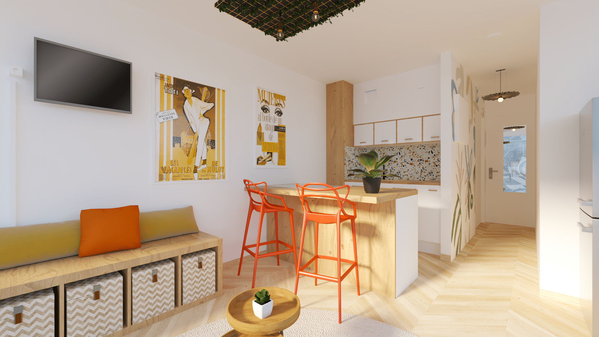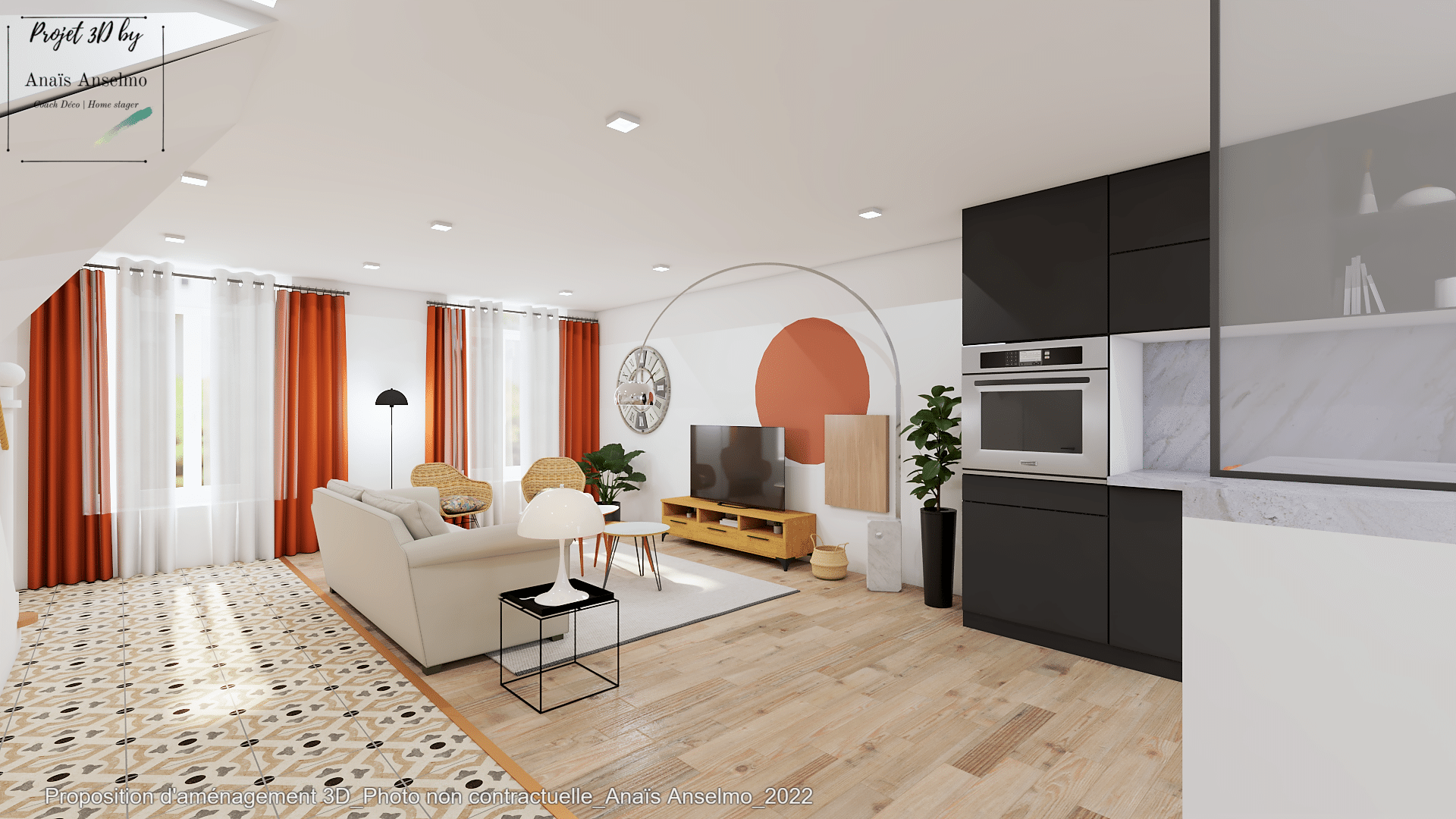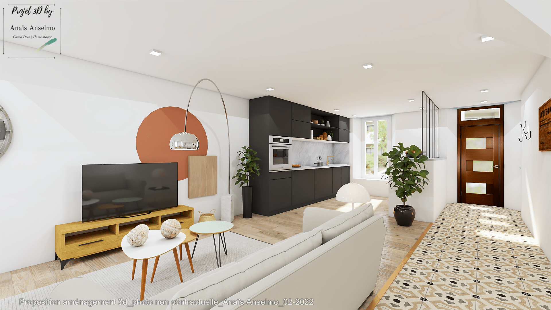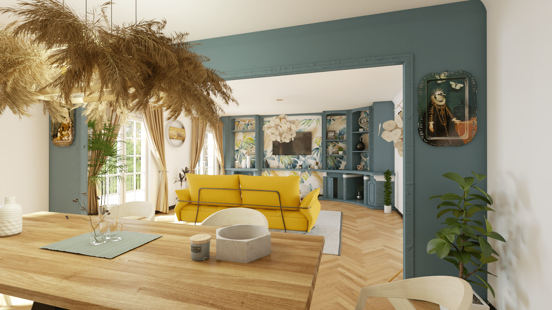 Dans cet appartement sur Perpignan, l’objectif était de garder la structure existante qui donne beaucoup de charme à la pièce. On y ajoute une touche d’originalité avec un papier peint fleuri et coloré. On a également proposé une ouverture sur la pièce arrière pour agrandir le séjour.