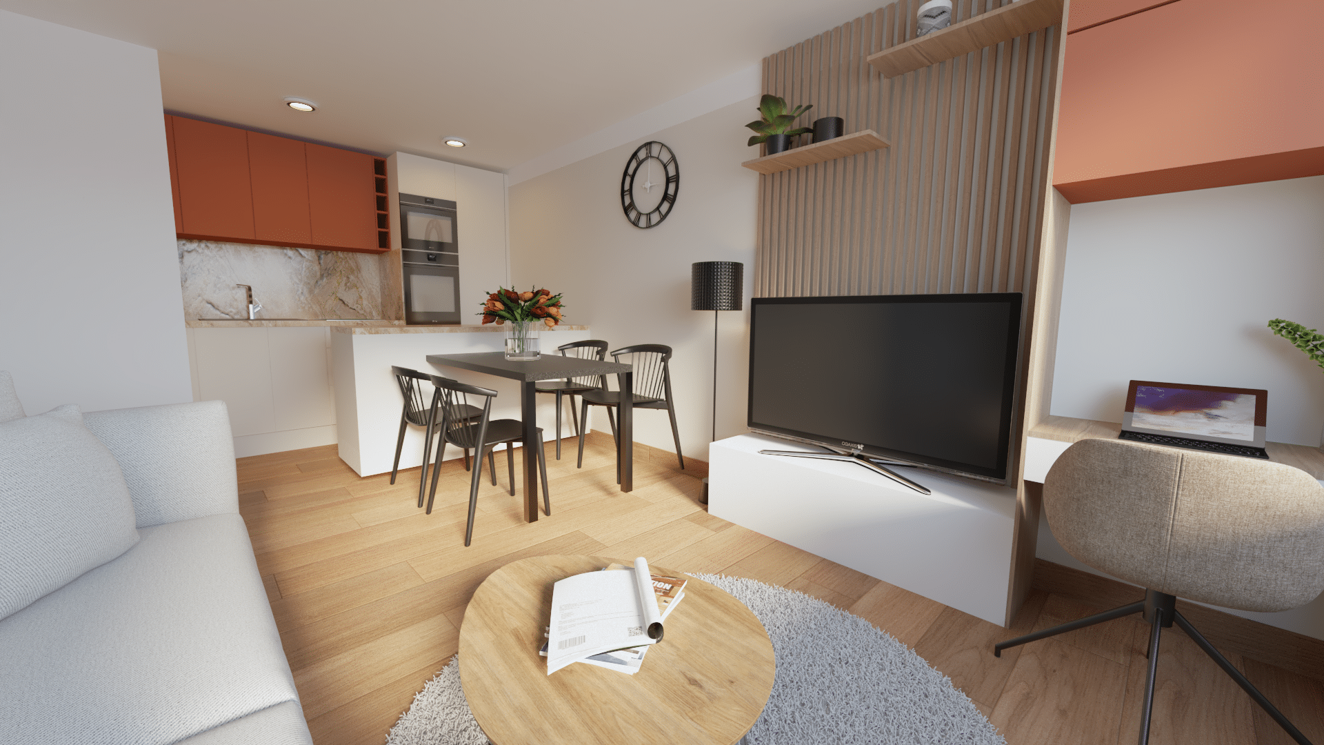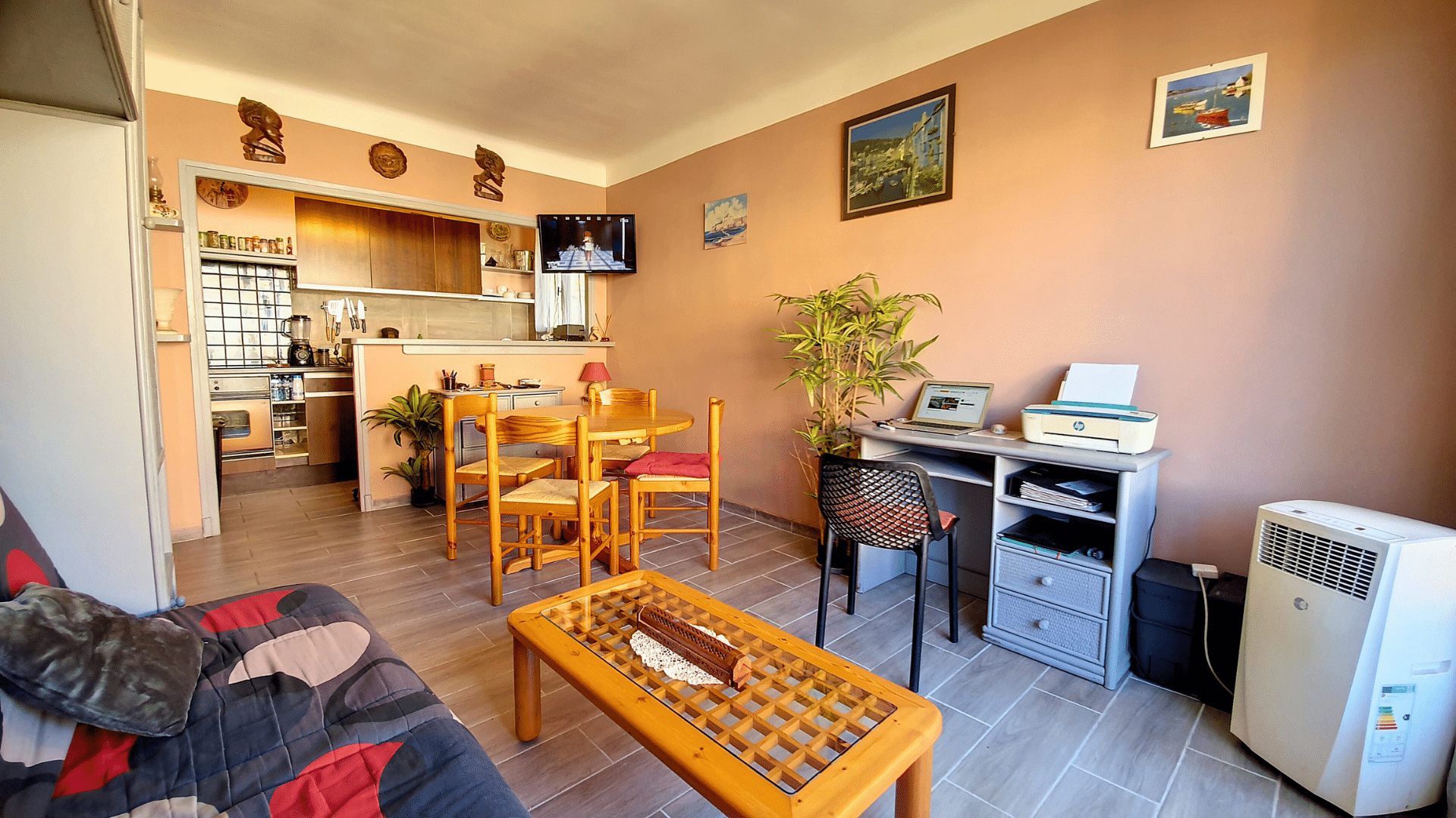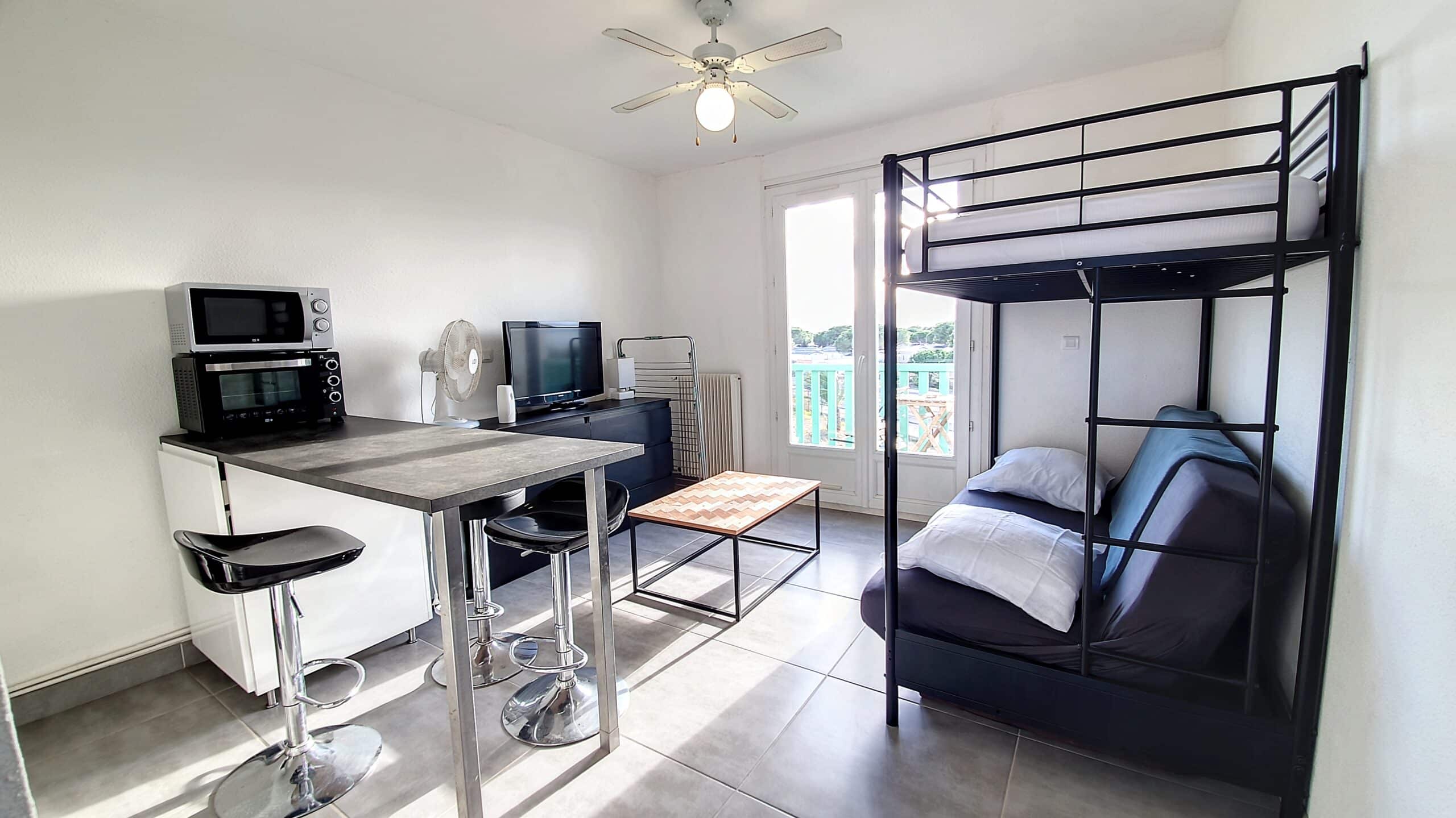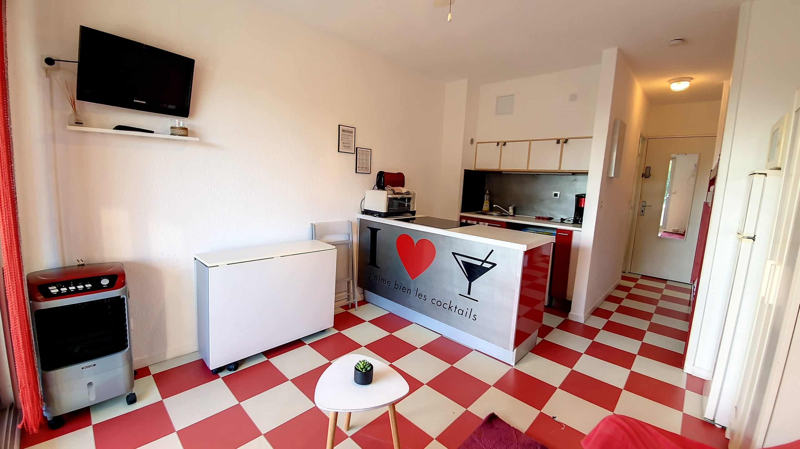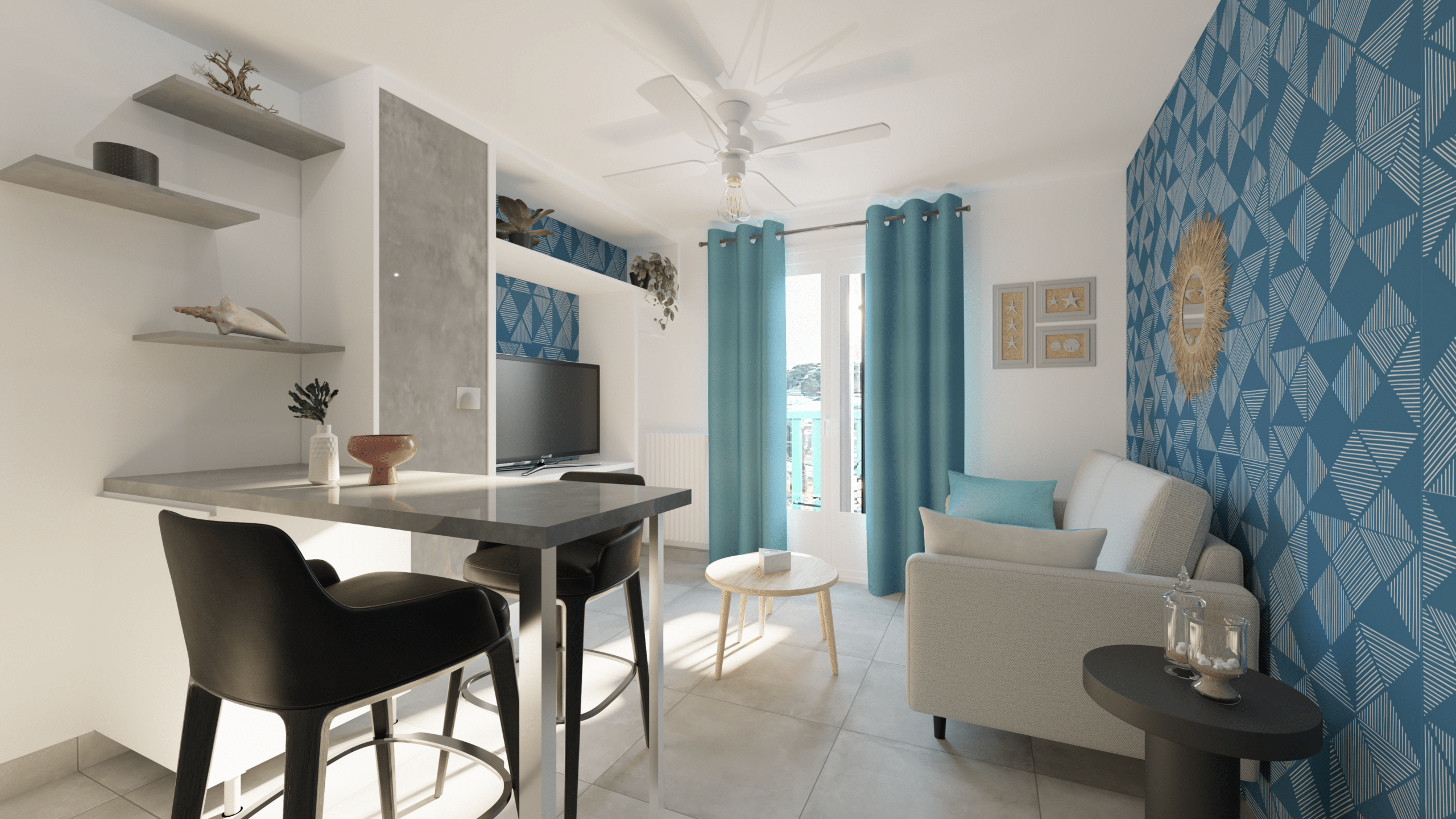 Dans cet appartement destiné à la location sur Argeles, nous avons pris le parti de perdre un couchage dans le séjour pour apporter un côté plus aérien et rendre au séjour sa fonction première. Le canapé lit pourra accueillir 2 personnes. On optimise également l’espace avec la création d’un meuble tv incluant des rangement pour stocker les affaires ou autres valises.