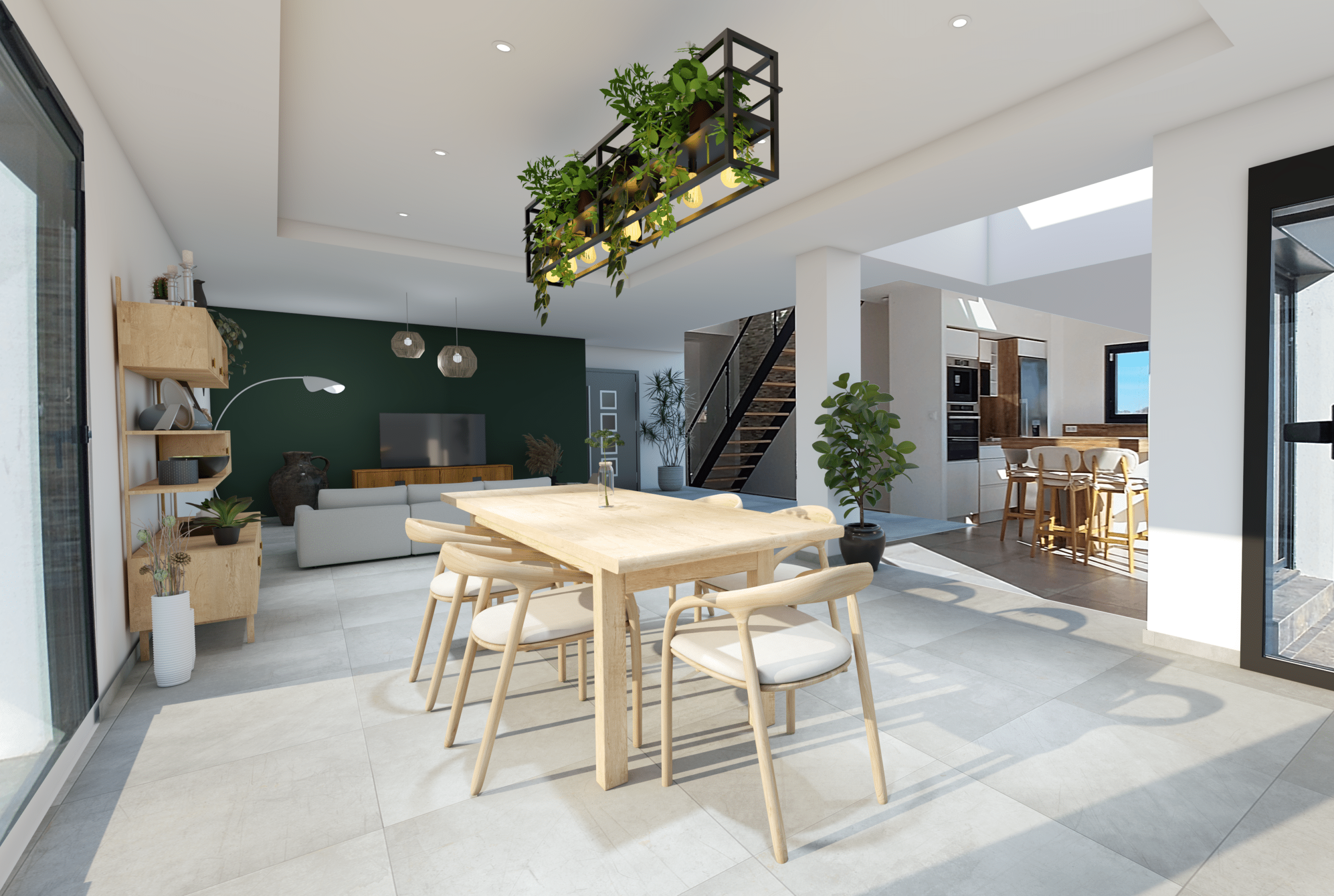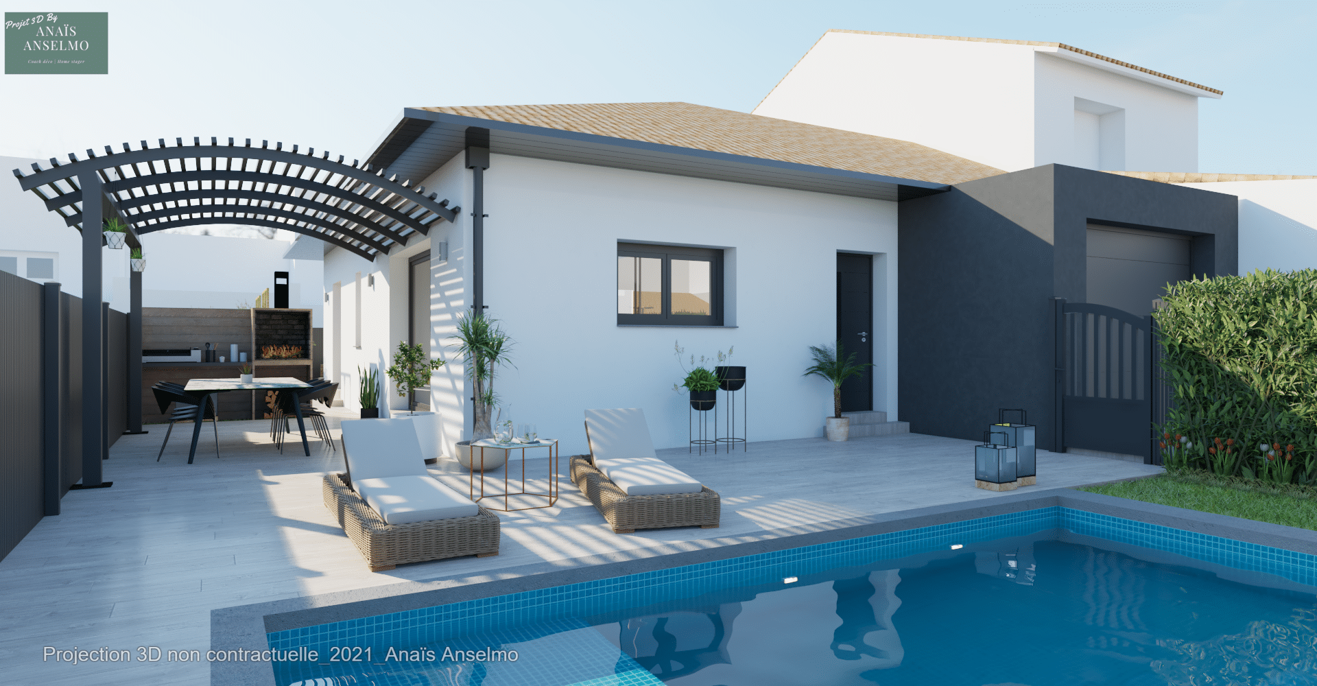 Les extérieurs sont également important dans une maison. Ici on imagine la fraicheur d’une piscine sous un ciel ensoleillé ainsi qu’un espace repas sous une jolie pergola.