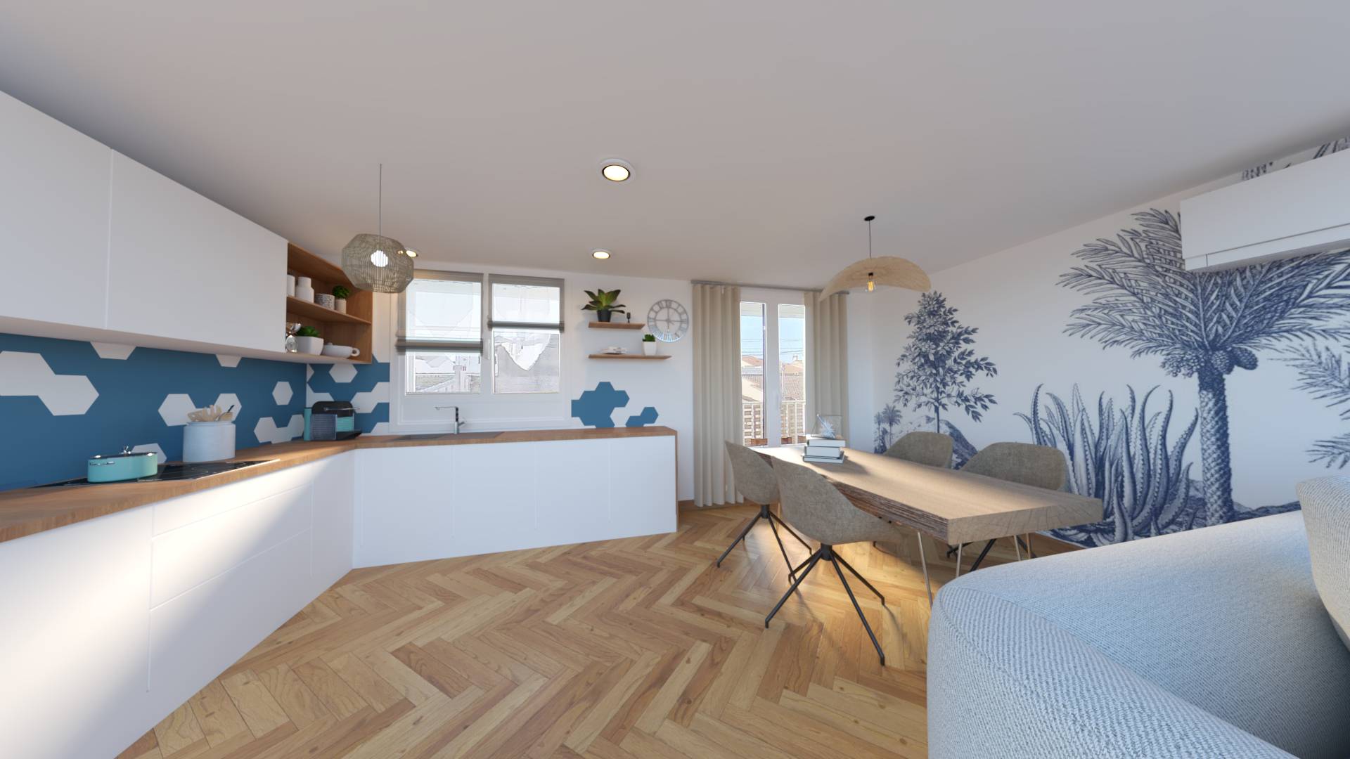 Home staging pour cet appartement sur Canet. Je propose une modernisation de la cuisine ainsi que de la pièce de vie. On ajoute un espace bureau pour pouvoir travailler ponctuellement. L’ambiance se veut douce et apaisante.