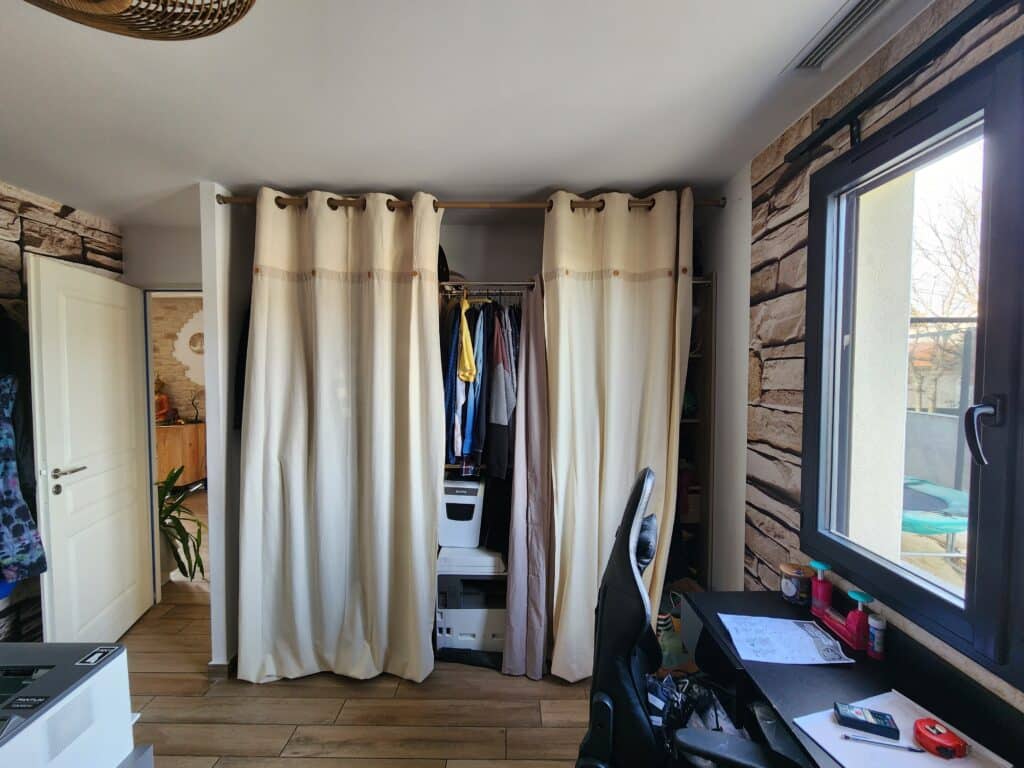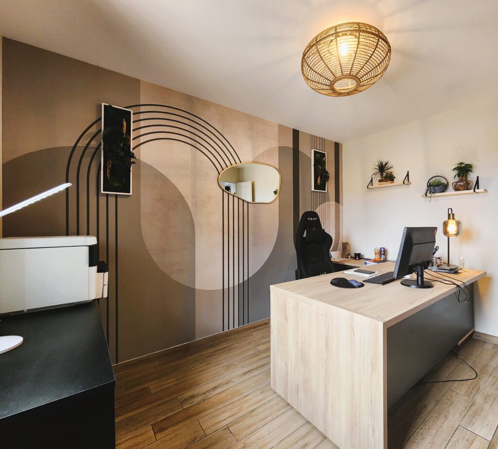 Le choix des couleurs douces et neutres, marié à des touches végétales, contribue à créer une atmosphère apaisante, essentielle pour les longues journées de télétravail. L’éclairage est un élément crucial dans ce type d’espace : un luminaire suspendu en rotin diffuse une lumière agréable et enveloppante, tandis que la lampe de bureau apporte une source de lumière directe pour les tâches nécessitant une précision particulière.