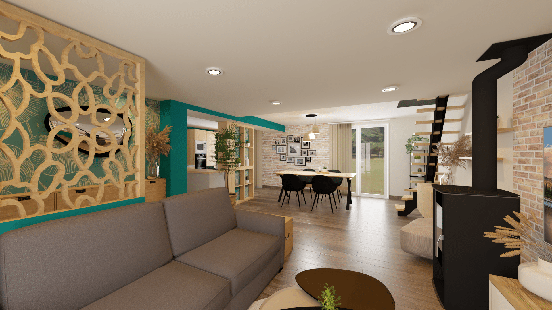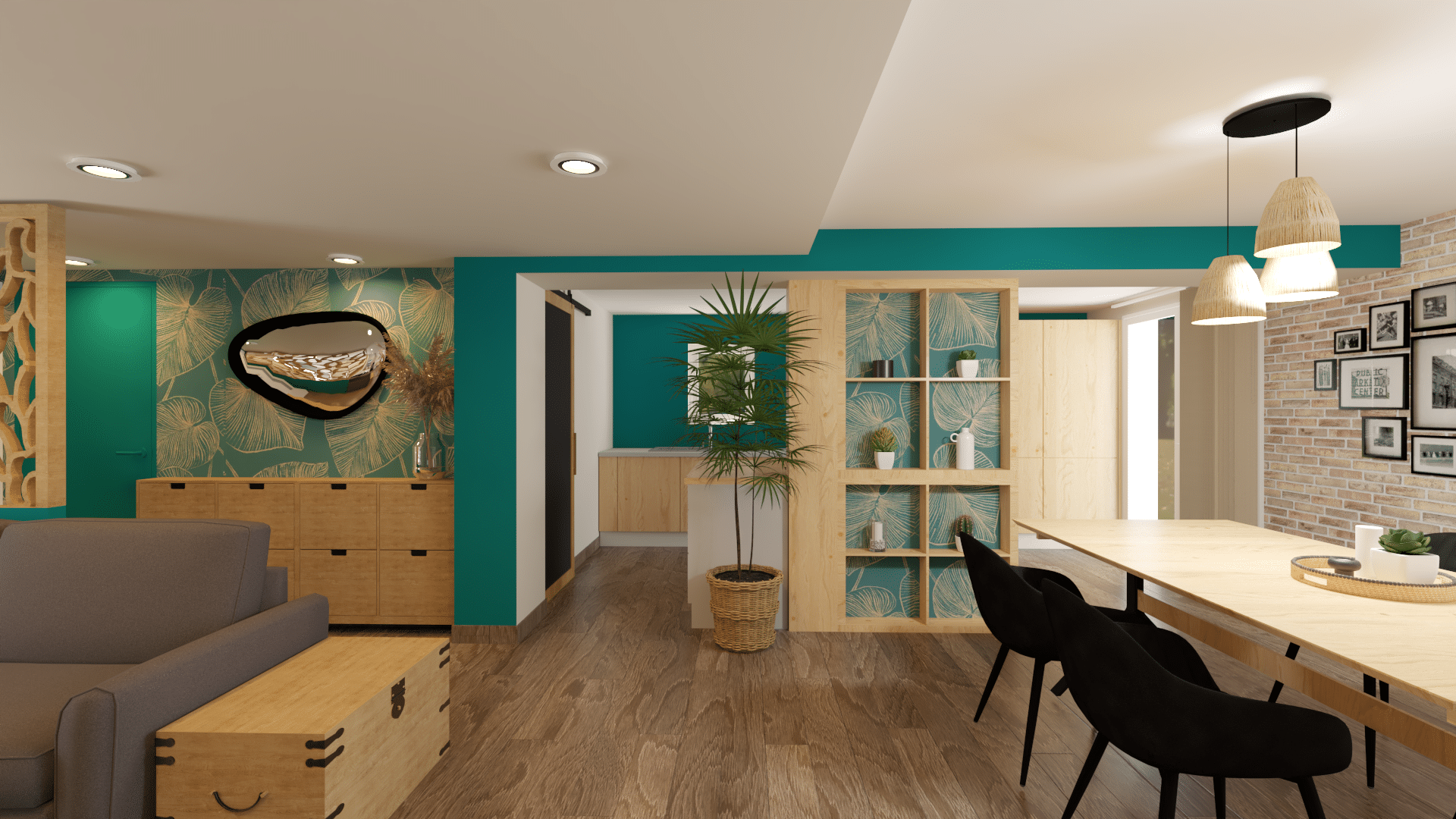 Nous avons misé sur des matériaux naturels comme le bois clair, combinés à des touches de couleurs profondes, notamment ce vert canard audacieux, pour dynamiser les volumes. Les espaces ont été repensés pour fluidifier les circulations : une cuisine ouverte parfaitement intégrée, un coin repas accueillant et un salon cosy. Chaque détail a été conçu pour favoriser le bien-être, depuis l’ajout de panneaux décoratifs ajourés qui structurent subtilement l’espace, jusqu’aux luminaires tressés qui apportent une douce chaleur.