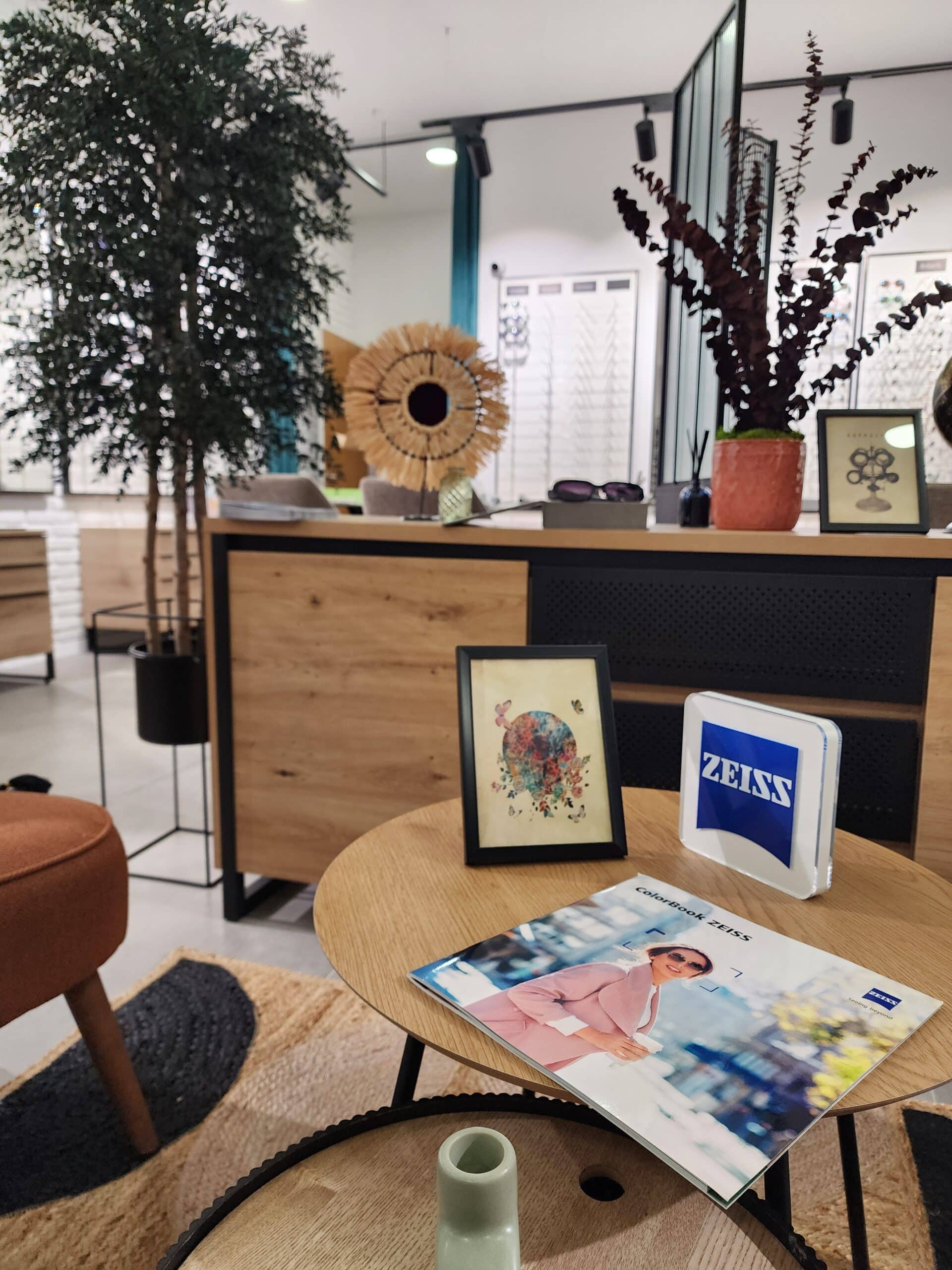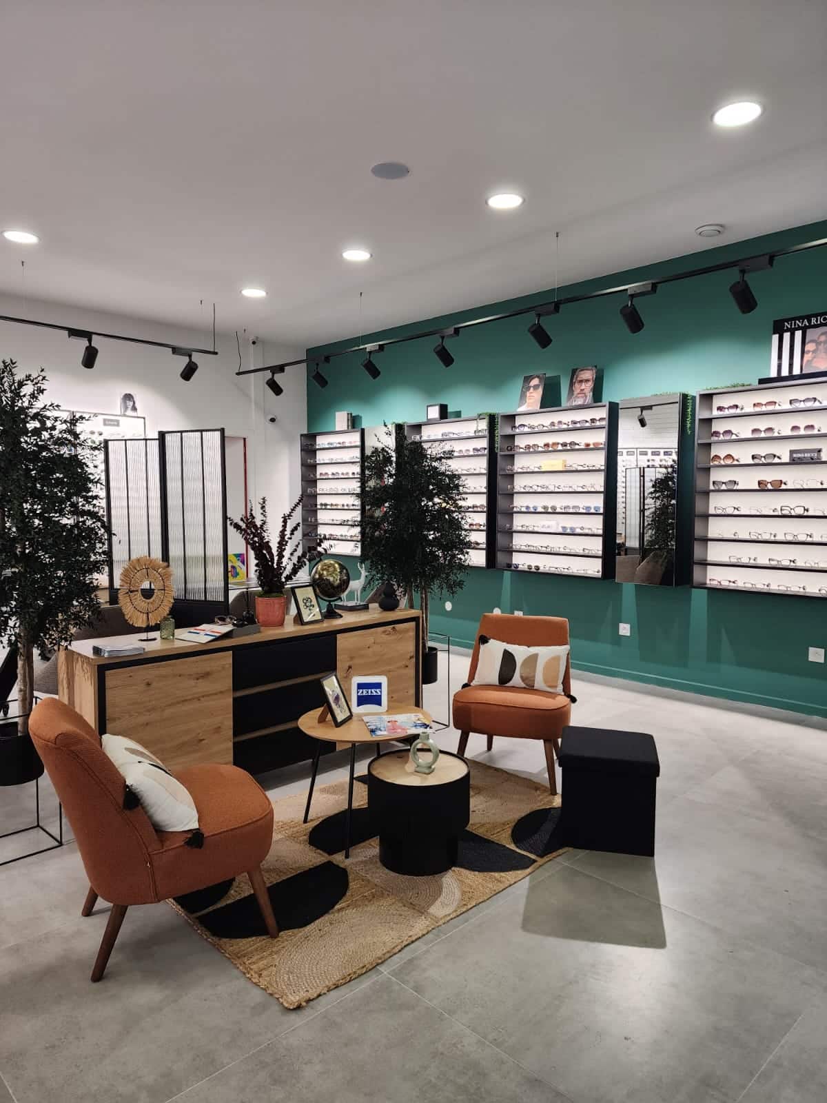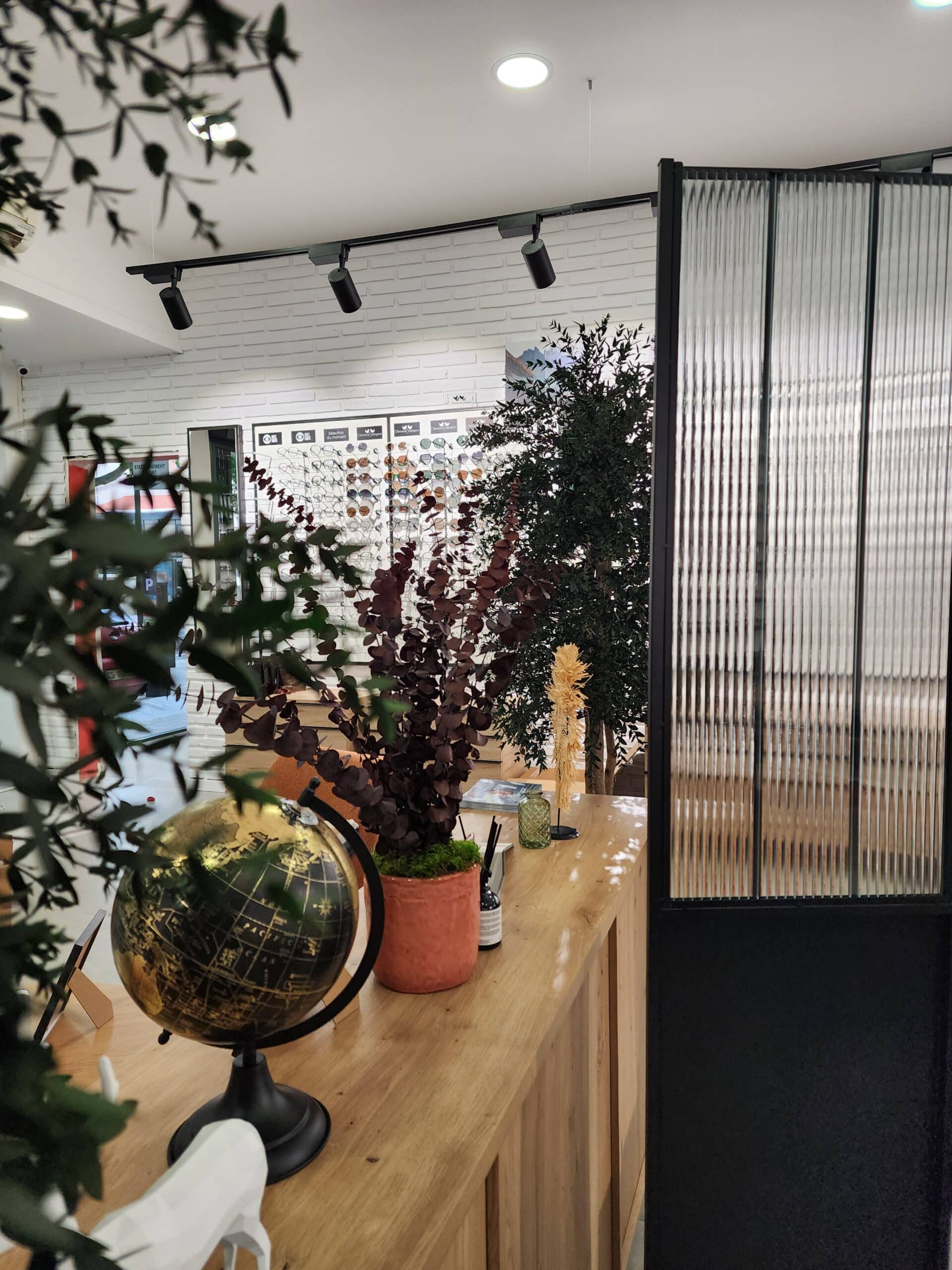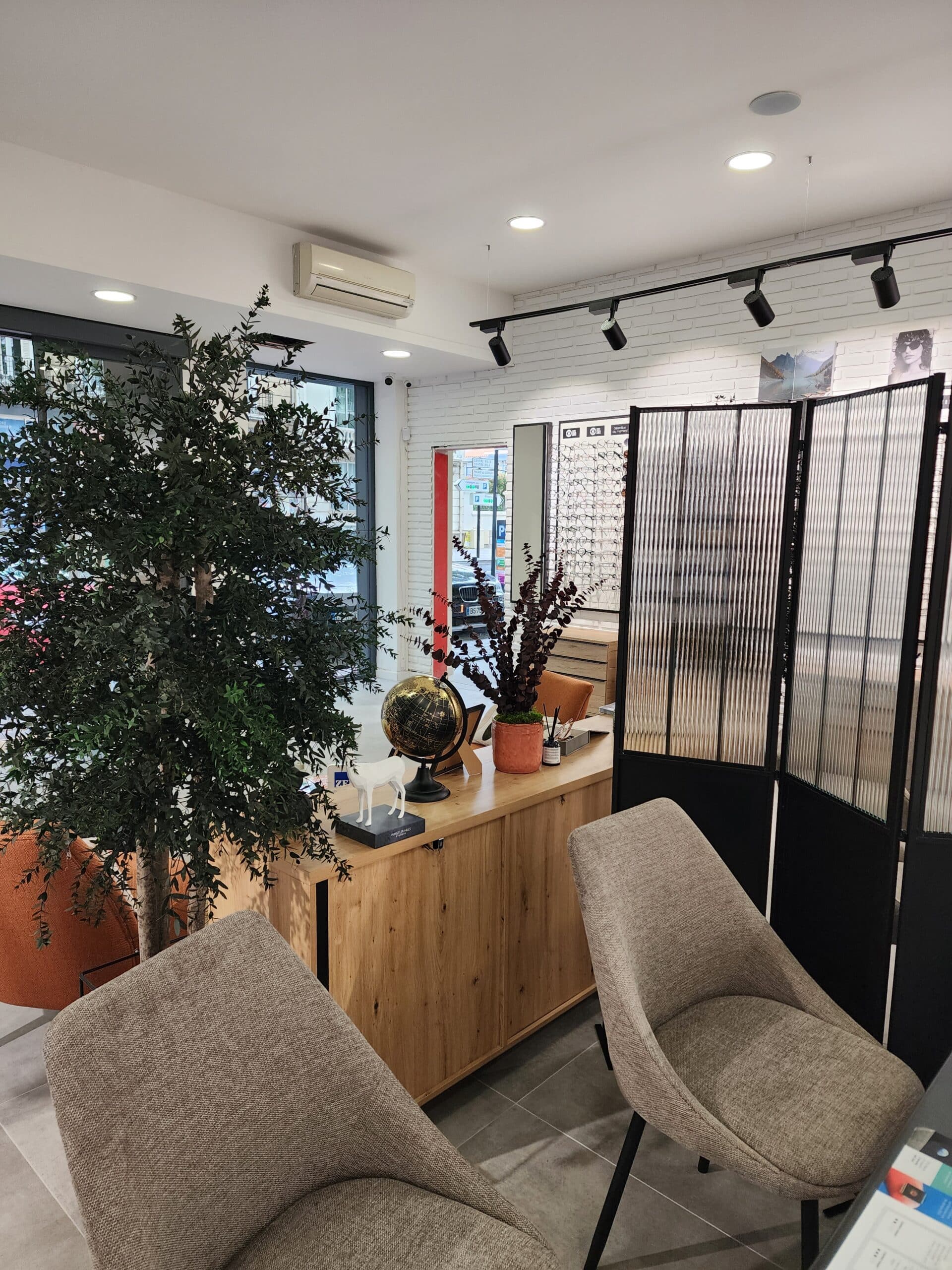 🌿 L’agencement du magasin d’optique a été structuré par zones : les espaces de circulation ont été fluidifiés pour faciliter la découverte des lunettes, et des éléments de séparation douce — plantes, buffet bas, paravent — permettent de délimiter sans cloisonner, en préservant la confidentialité des rendez-vous clients.