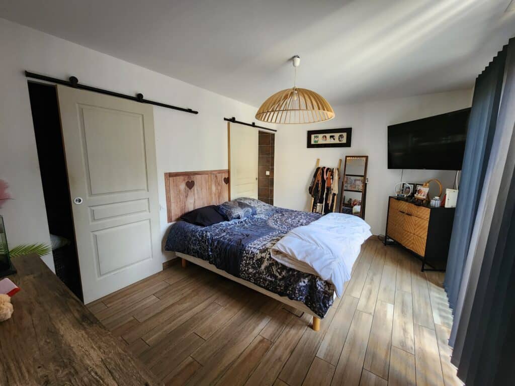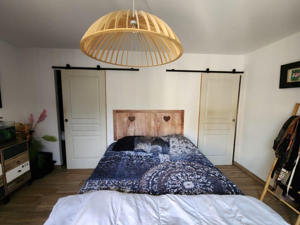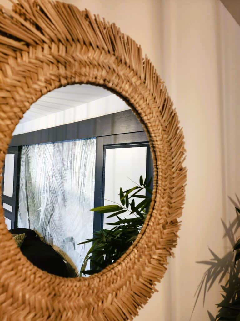 Les teintes naturelles, associées aux touches de vert, contribuent à une atmosphère apaisante et réconfortante, propice au repos. Le mobilier en bois et les luminaires en rotin apportent une dimension chaleureuse à l’ensemble, favorisant un sentiment de bien-être. Les textiles doux et moelleux, comme le plaid turquoise et les coussins assortis, ajoutent la touche cocooning nécessaire pour se relaxer après une longue journée.
